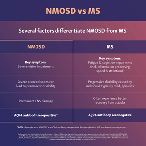 Bisher wurde NMOSD aufgrund der Ähnlichkeit mit anderen Erkrankungen wie MS häufig fehldiagnostiziert oder übersehen.10 Es handelt sich jedoch um zwei verschiedene Erkrankungen, d. h. NMOSD ist eine eigenständige Krankheit. Das klinische Bild, der Krankheitsverlauf sowie die Behandlungsstrategien und Therapieergebnisse sind sehr unterschiedlich.